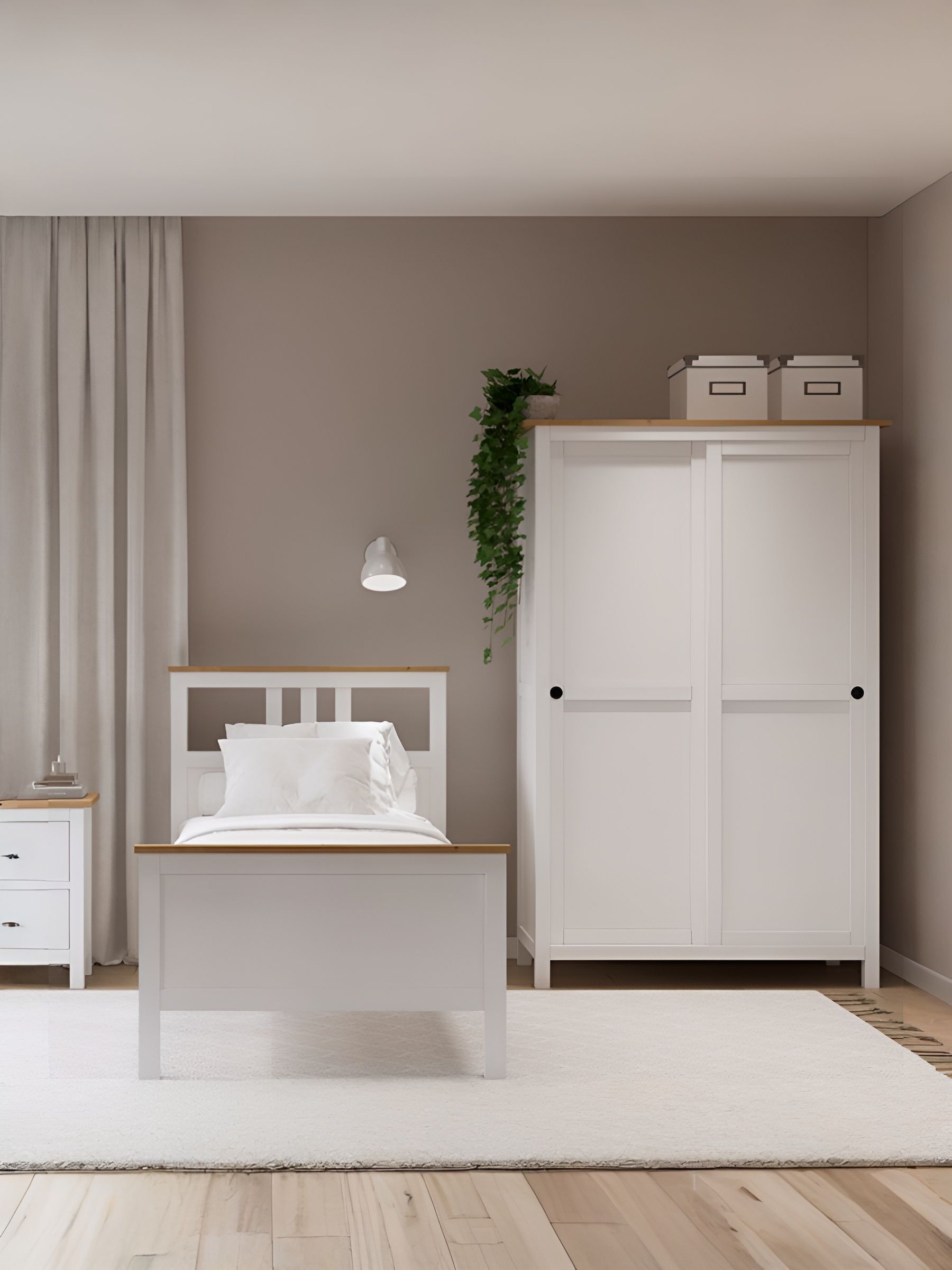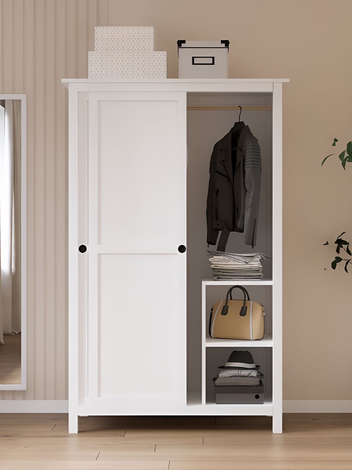 Шкаф ИКЕА выполнен в белом цвете с элементами светло-коричневого, что добавляет ему теплоты и гармонии. С размерами 198х90х37 см, он достаточно вместителен, чтобы организовать все ваши вещи, а три ящика предоставляют дополнительное пространство для хранения мелочей.