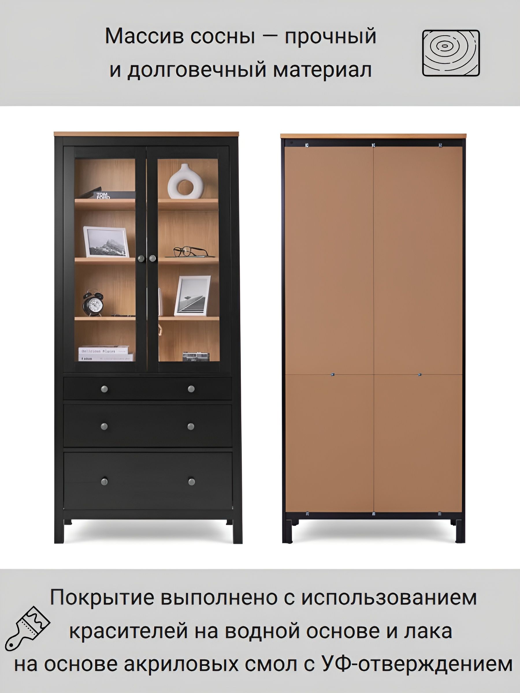 Шкаф КЫМОР с дверцами имеет элегантный дизайн, который легко вписывается в различные стили интерьера, от классического до современного. Благодаря открытым полкам вы можете демонстрировать свои любимые книги, фоторамки или декоративные элементы, а закрытые ящики позволят скрыть менее эстетичные предметы.