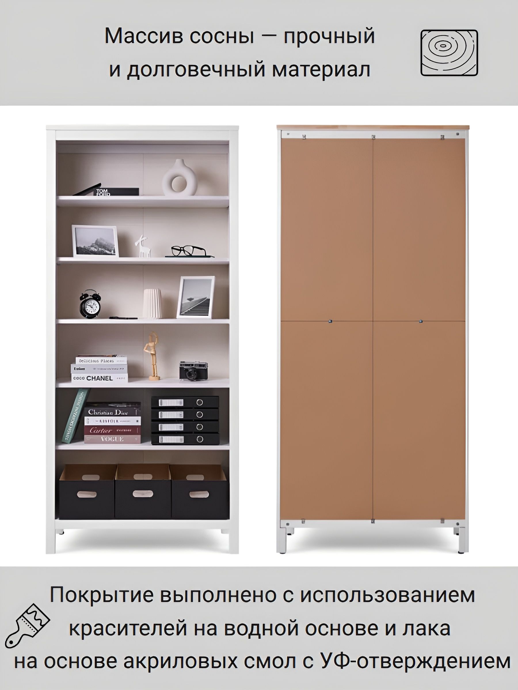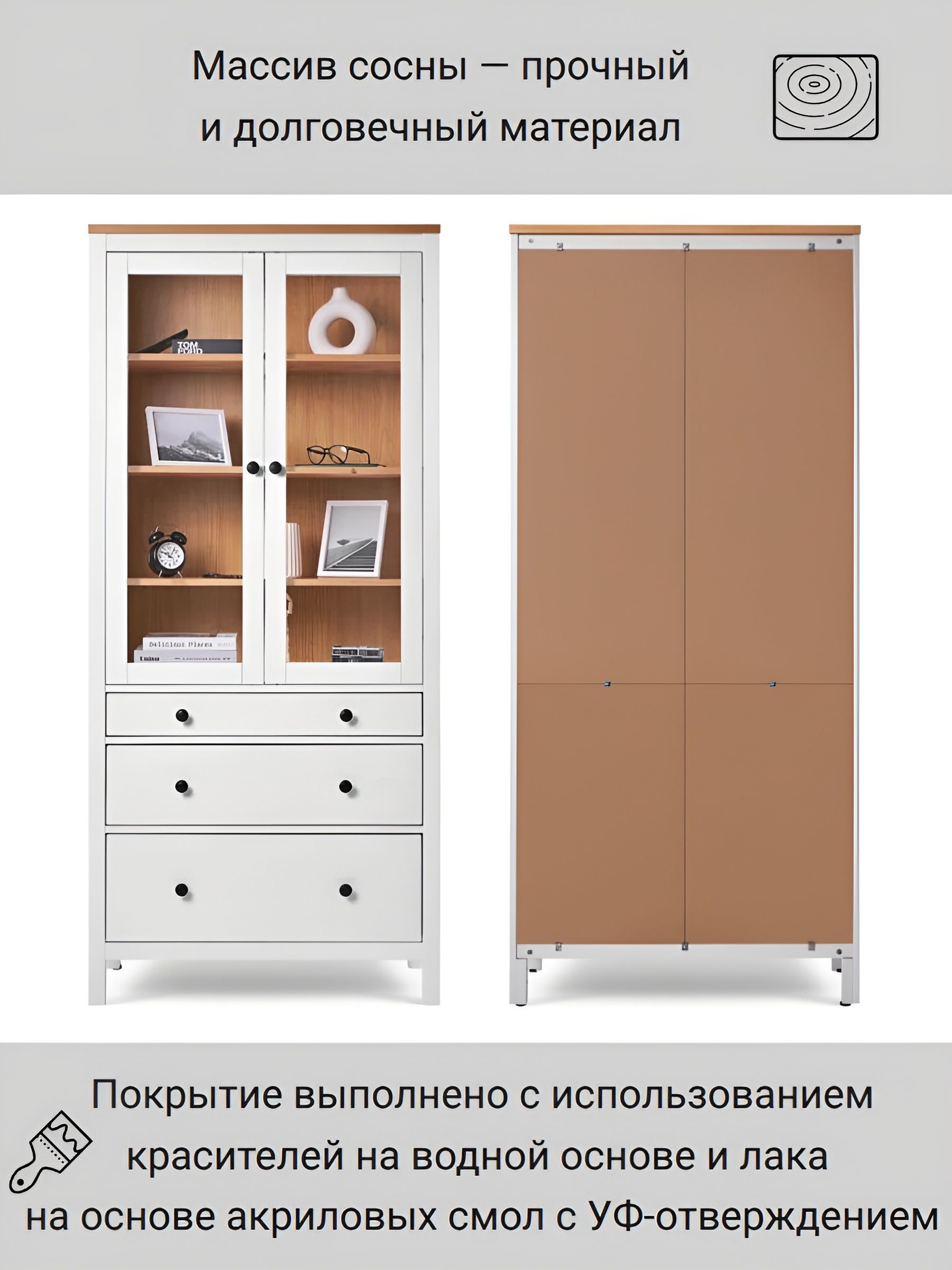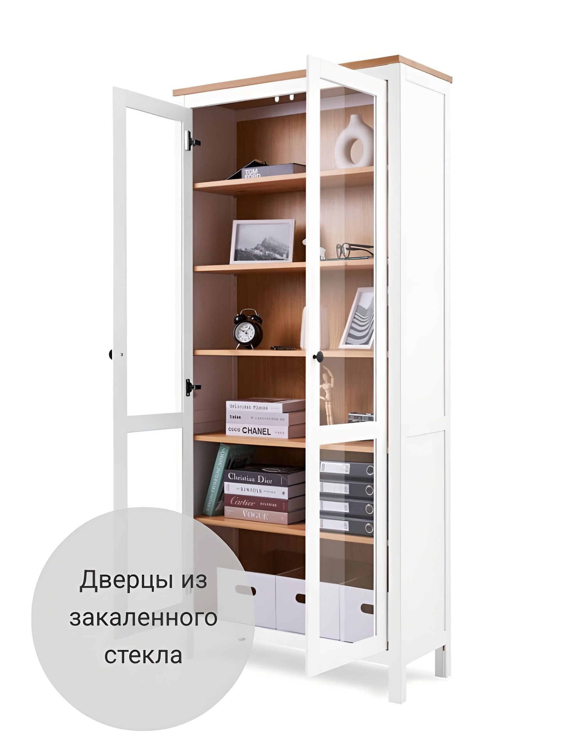 Шкаф КЫМОР с дверцами имеет элегантный дизайн, который легко вписывается в различные стили интерьера, от классического до современного. Благодаря открытым полкам вы можете демонстрировать свои любимые книги, фоторамки или декоративные элементы, а закрытые ящики позволят скрыть менее эстетичные предметы.