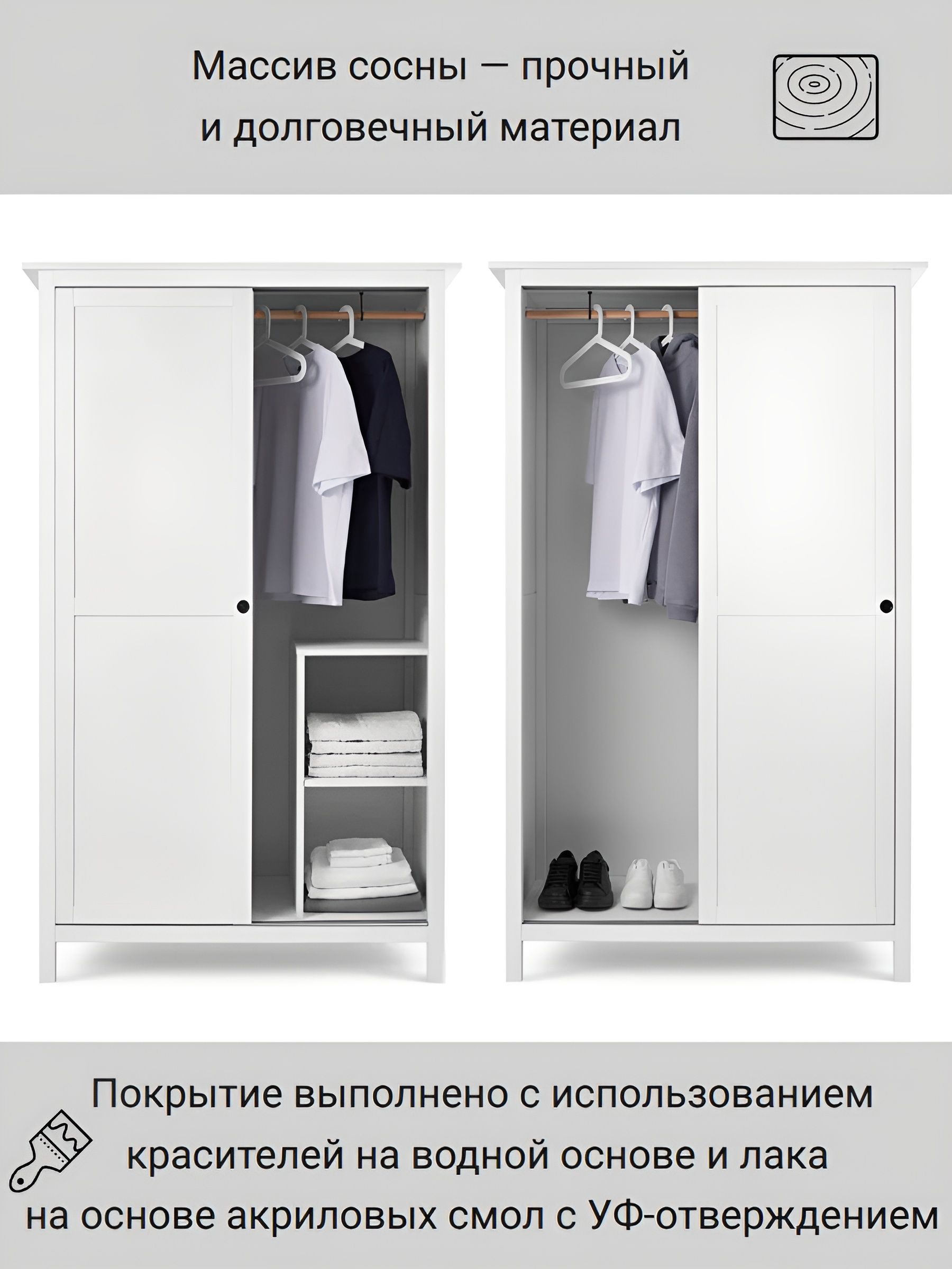 Шкаф ИКЕА выполнен в белом цвете с элементами светло-коричневого, что добавляет ему теплоты и гармонии. С размерами 198х90х37 см, он достаточно вместителен, чтобы организовать все ваши вещи, а три ящика предоставляют дополнительное пространство для хранения мелочей.